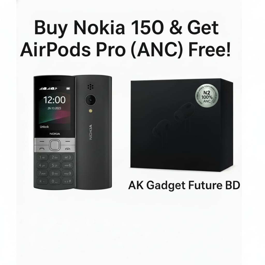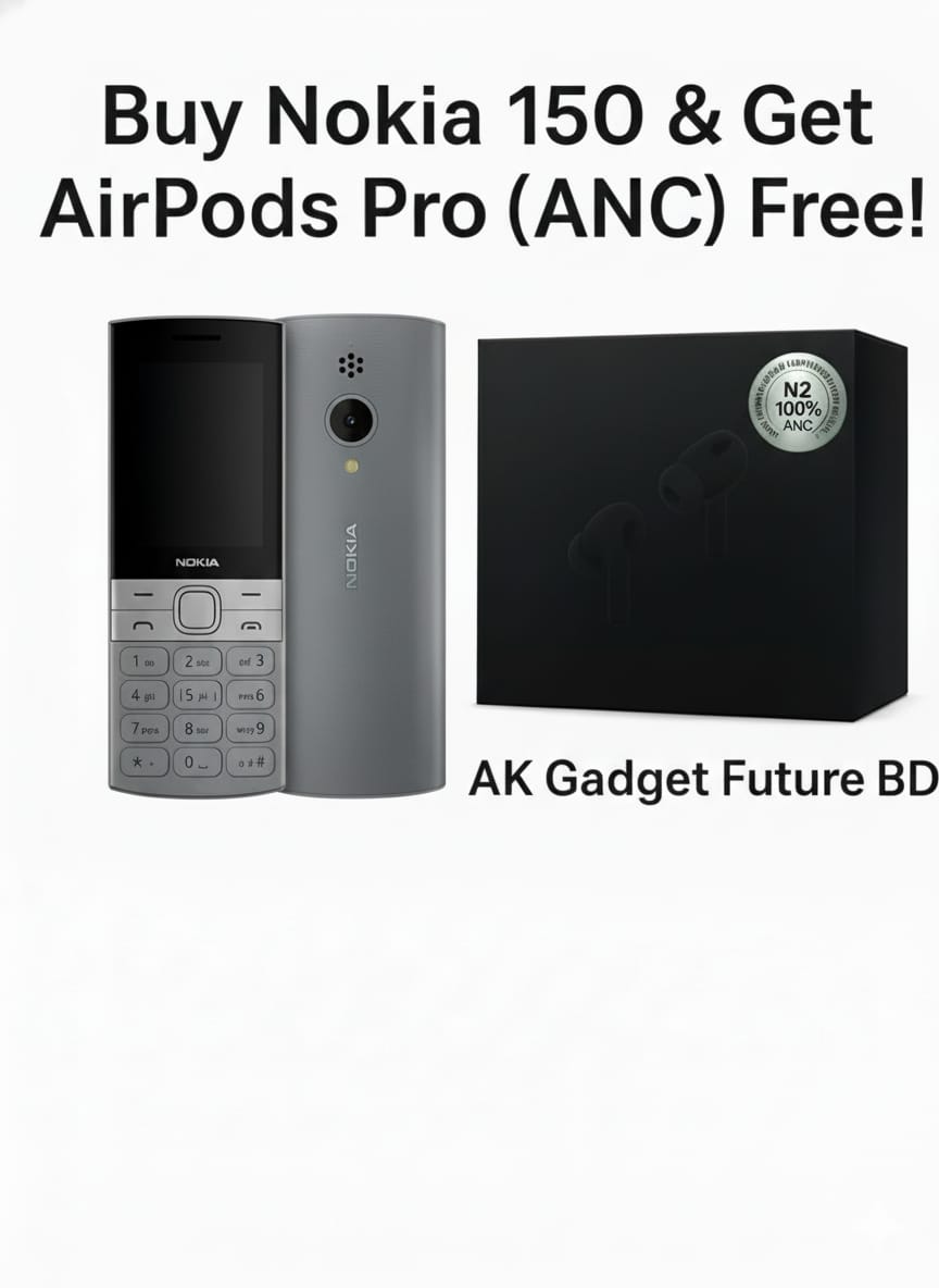 Nokia 150 + AirPods Pro (ANC) Free!একটি অসাধারণ সুযোগ! এখনই কিনুন Nokia 150 ফোন এবং সঙ্গে পাচ্ছেন AirPods Pro (Active Noise Cancelling) একদম ফ্রি!দীর্ঘ ব্যাটারি ব্যাকআপ, ক্লাসিক ডিজাইন ও টেকসই পারফরম্যান্সের সাথে Nokia 150 আপনাকে দেবে নির্ভরযোগ্য মোবাইল অভিজ্ঞতা।আর AirPods Pro (ANC) দেবে প্রিমিয়াম মিউজিক কোয়ালিটি ও নয়েজ ক্যানসেলিং সুবিধা।